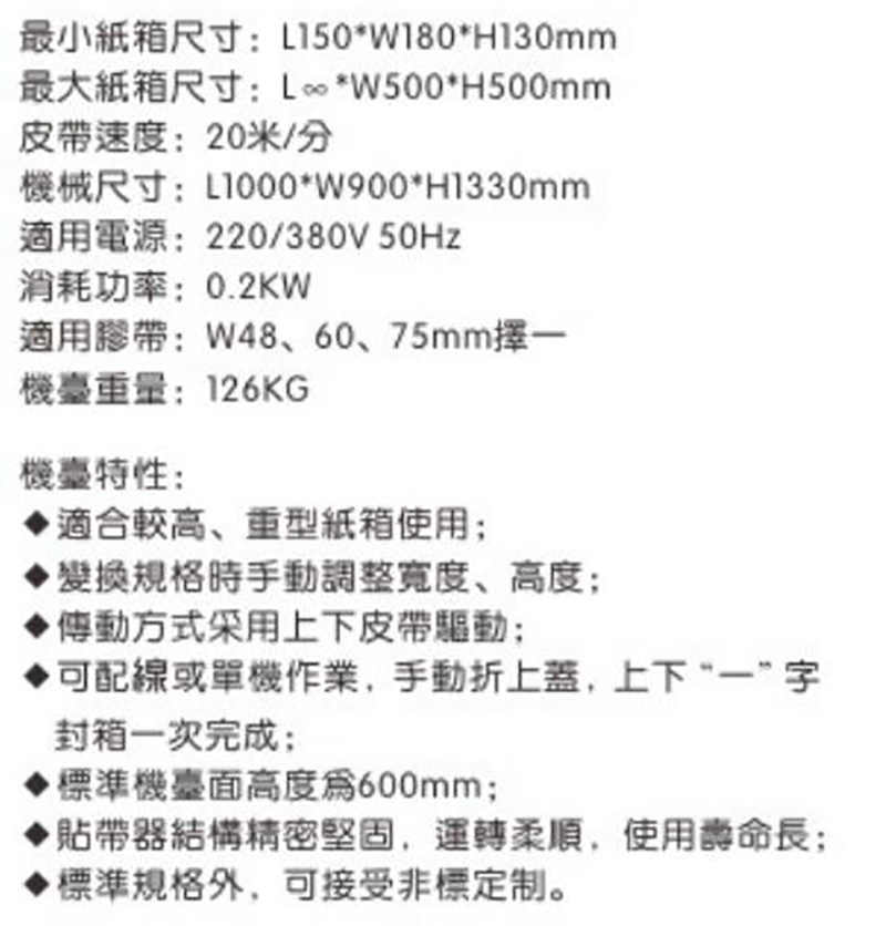 ·操规格陡手助稠整H度、高度; ·傅勒方式朵用上下皮带噩; ·可配绵或罩楼作举,手勤折上蓝,上下"—”字封箱一次完成; ·手润4皇面高M露60omm; ·贴带器V情精密壑固,踵⒁柔见,使用毒命是: 德颂规格外,可接受非懦定制。