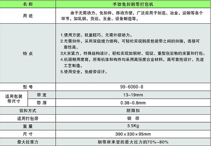 ·使用方便、机重轻巧、无需外接动力。 ·无需扣件,采用双级增力结构,可轻松实现钢质包装带之间的扣接,连接可靠性高。 ·大束紧力,特殊结构设计,轻松实现如钢材、铝锭、重型包装物的束紧和打包。 ·机器耐用度高,所有机体和构件均采用高强度合金材料、高可靠性设计、先进工艺制造。 ·使用安全,免疲劳设计。