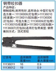 ·钢制结构,耐用性好,适用场合:中型打包可选方案一:11136008(打包带)+11136010(收紧器)+11136011(咬扣器)+11136006(打包扣);可选方案二:11136009(打包带)+11136010(收紧器)+11136012(咬扣器)+11136007(打包扣)适用打包带类型:钢带做扣方式:顶式双咬