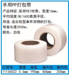 ·采用PET材质。宽度16mm。 ·适合轻型单件货物的打包。 ·每卷长度2500m。白色