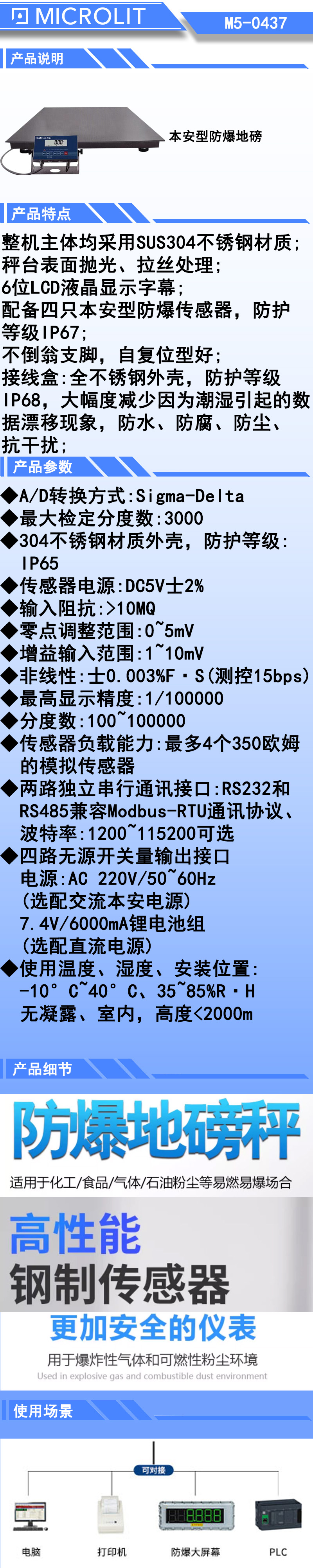 * 整机主体均采用SUS304不锈钢材质;秤台表面抛光、拉丝处理; * 6位LCD液晶显示字幕; * 配备四只本安型防爆传感器,防护等级IP67; * 不倒翁支脚,自复位型好; * 接线盒:全不锈钢外壳,防护等级IP68,大幅度减少因为潮湿引起的数据漂移现象,防水、防腐、防尘、抗干扰; * 具备置零、去皮、累计、计重、检重、打印等现场功能要求;