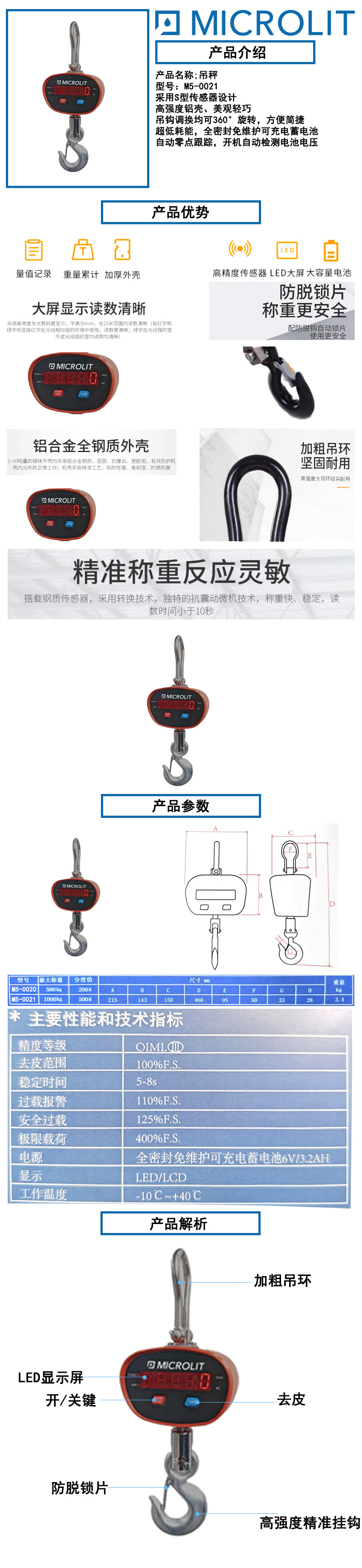 *采用S型传感器设计,高强度铝壳、美观轻巧 *吊钩调换均可360℃旋转,方便简捷 *超低耗能,全密封面维护可充电蓄电池 *自动零点跟踪,开机自动检测电池电压