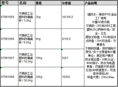·超强防水,等级lP68,适合工厂使用 · 计重/计数功能 ·不锈钢(SS)和ABS工程塑料(SU)两种外观,安全,卫生 · 固定式称盘(SG)和活动式秤盘(SH)可选择,方便清洗 ·不锈钢按键,保护面贴不受伤 · 多个分度值和计量单位,满足用户要求 ·防水感应器,OIML认证,ROHS指令,防水充电器 ·单面、双面显示供选择 ·红色LED快速显示,可选择存绿色LED ·秤盘尺度:230x190mm