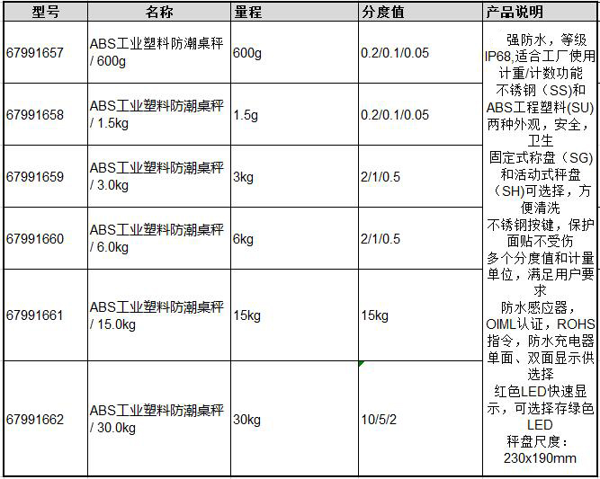 B17012 67991662 30kg 10/5/2 防潮桌秤 230×190mm 塑料秤或不锈钢 2169.60