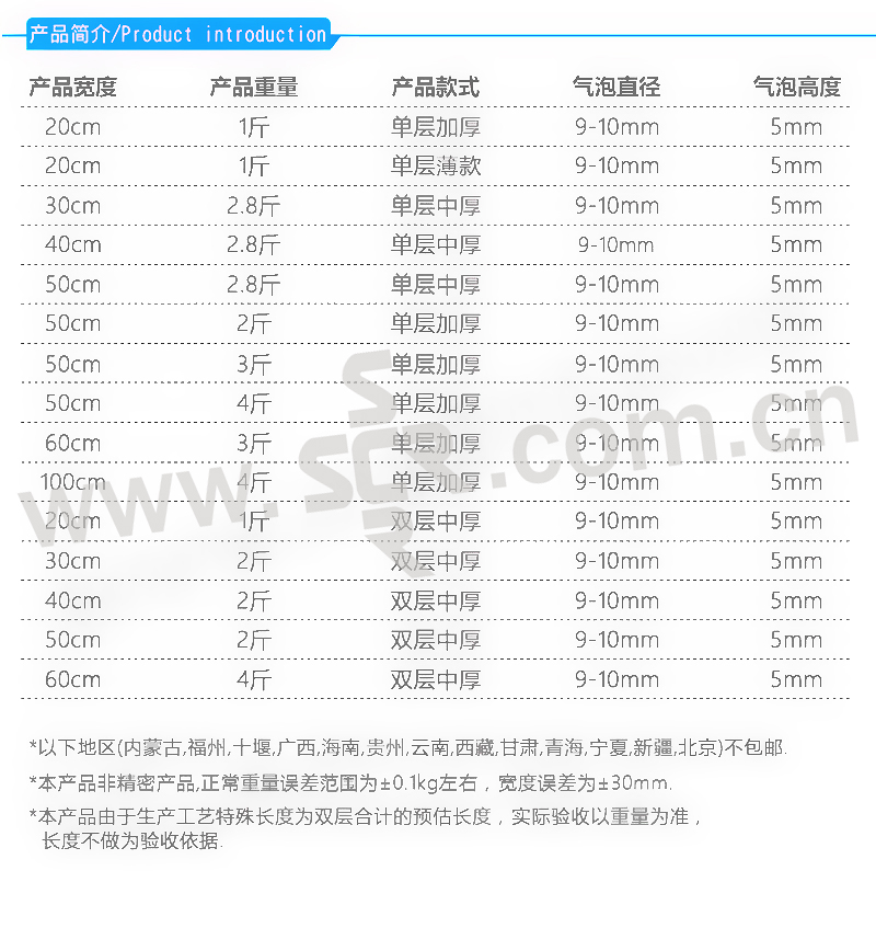 PUDI/浦帝 薄款单层气泡膜 QPM-BK-201 气泡直径10mm 500g 1卷