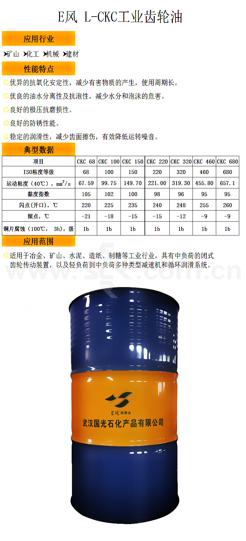 ·良好的抗氧化安定性、油水分离性及抗泡性、极压抗磨损性、防锈性能及稳定的润滑性。