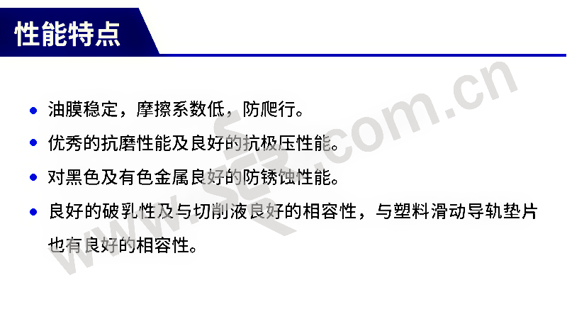 ·适用于各种精密机床水平和立式导轨润滑油。能有效防止导轨的爬行。根据粘度的要求,又可兼作液压油、齿轮油。满足并超过DINCGLP等级。