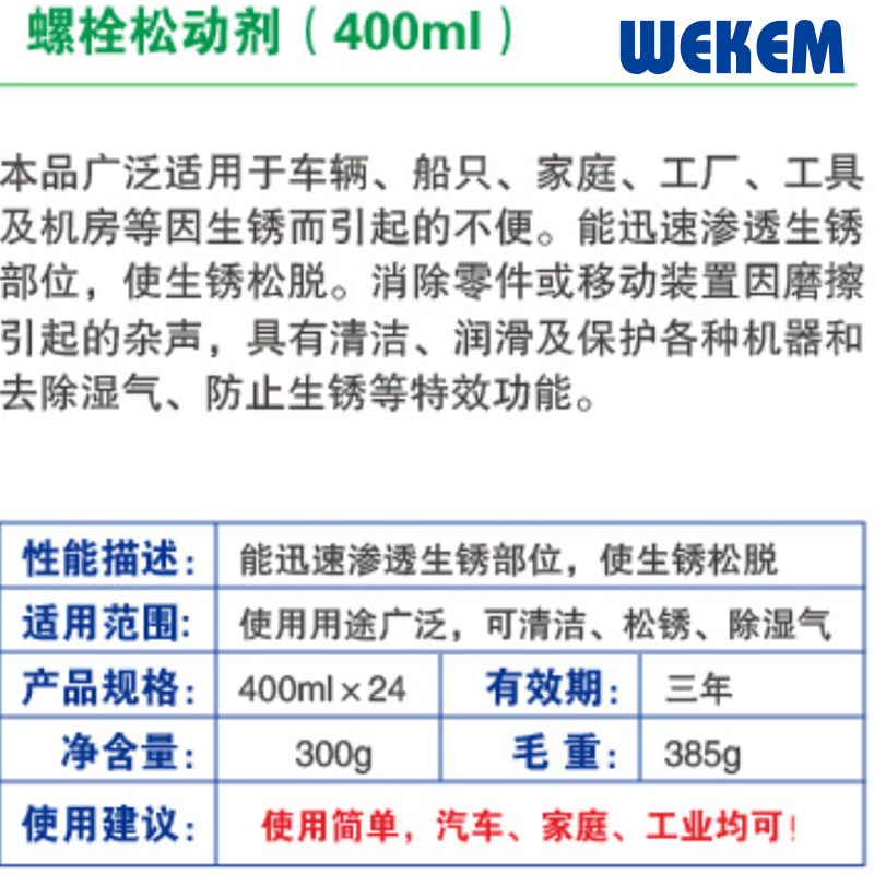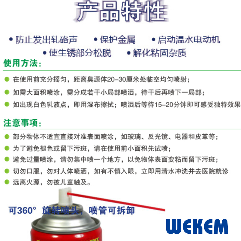 ·能迅速渗透生锈部位,使锈松脱。消除零件或移动装置因磨擦引起的杂声,具有清洁、润滑及保护各种机器和去除湿气、防止生锈等功能。