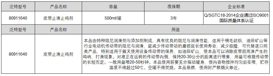 ·本品由特种阻尼润滑剂与添加剂制成,具有优良的阻尼与润滑性能,适用于棉毛纺织,油田矿山等行业电动机传动带的阻尼与润滑,能减少传动带动的磨损延长使用寿命,减少故障,可代替进口同类产品,特别适用于露天使用设备传动带的保养,如油田矿山,使本品可以消除皮带因雨淋产生的鸣响,打滑现象。对准正在运转的传动带内侧,保持20-30公分的距离进行喷雾,用量可根据传动带的长短而定。一般用量喷20-50秒钟。本品使用前要充分摇动罐身,使内容物搅拌均匀后在喷,贮存温度不得超过50℃。空罐不得焚烧。本品易燃,使用时严禁烟火靠近。