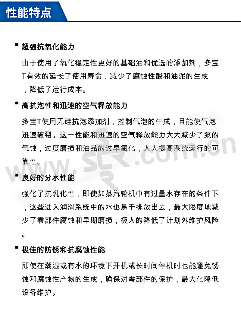 ·抗氧化: 超强抗氧化能力,减少了腐蚀性酸和油泥的生成,降低了运行成本。 ·防锈防腐: 良好的分水性能,减少了零部件腐蚀和早期磨损,有效降低计划外维护风险。极佳的防锈和防腐蚀性能,确保对零部件的保护,最大化降低设备维护。 ·抗泡排气: 高抗泡性和迅速的空气释放能力,减少了泵的气蚀,过度磨损和油品的过早氧化,提高系统运行的可靠性。 ·抗氨配方: 良好的抗氨反应能力,最大化的降低油品中氨溶解/不溶解产物对油品损害的可能性。