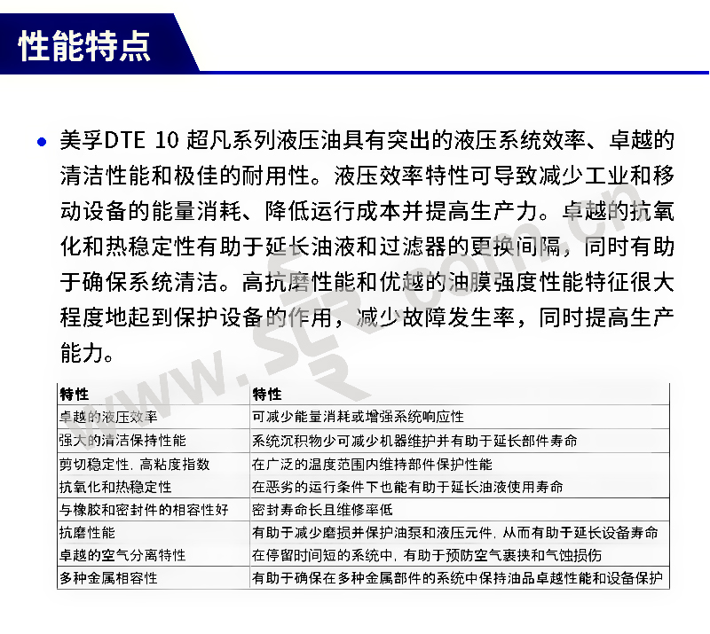 ·效率高: 粘度变化幅度小、优良的清洁度、卓越的过滤性等特性可保证系统的高效。 ·寿命长: 良好的氧化稳定性。 ·抗磨损: 采用高质量的抗磨添加剂,可在各种运行条件下保持高效。