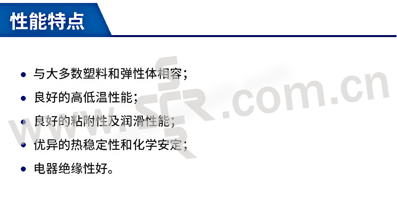 ·与大多数塑料和弹性体相容 · 与大多数塑料和弹性体相容 · 良好的高低温性能 · 良好的粘附性及润滑能 · 优异的热稳定性和化学安定