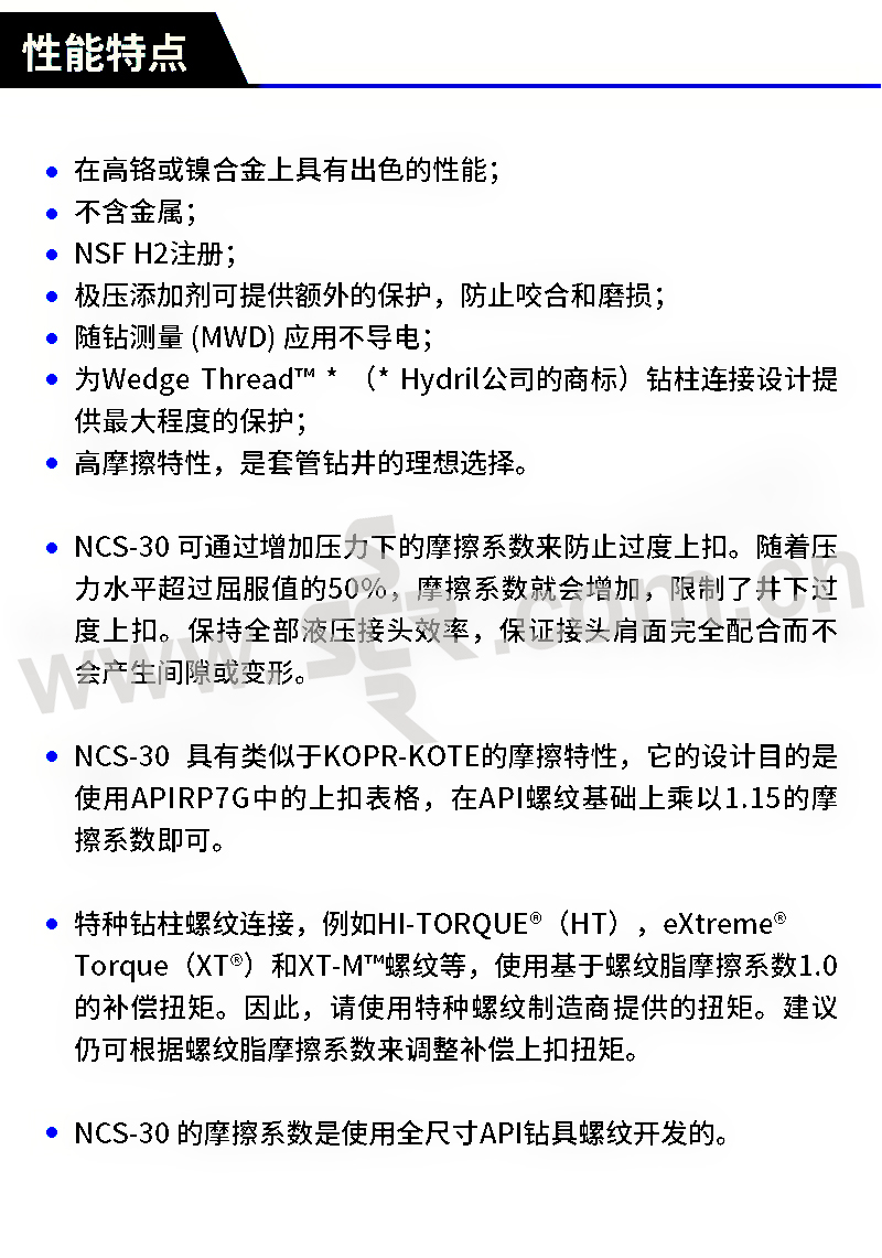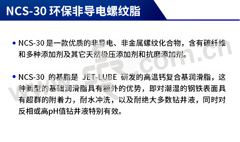 ·NCS-30 是一款优质的非导电、非金属螺纹化合物,含有碳纤维和多种添加剂及其它天然极压添加剂和抗磨添加剂。·NCS-30 的基脂是 JET-LUBE 研发的高温钙复合基润滑脂,这种新型的基础润滑脂具有额外的优势,即对潮湿的钢铁表面具有超群的附着力,耐水冲洗,以及耐绝大多数钻井液,同时对反相或高pH值钻井液特别有效。· 在高铬或镍合金上具有出色的性能· 不含金属· NSF H2注册· 极压添加剂可提供额外的保护,防止咬合和磨损· 随钻测量 (M