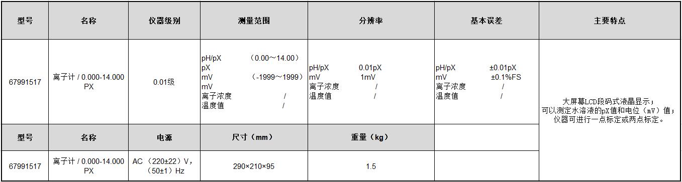 规格:  pH pX(0.00~14.00)pX 制造商型号:  67991517