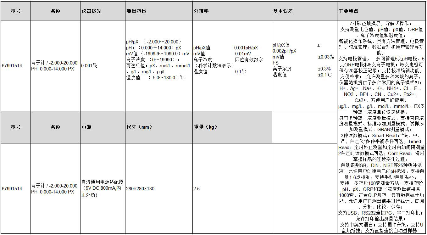 ·7寸彩色触摸屏,导航式操作; ·支持测量电位值、pH值、pX值、ORP值、离子浓度值和温度值; ·智能化操作系统,具有方法管理、电极管理、校准管理、数据管理和用户管理等功能; ·支持电极管理,较多可管理5支pH电极、5支ORP电极和5支离子电极;每支电极可保存20套校正记录;支持校准编辑功能,方便校准; 允许测量多种常规的离子,仪器随机提供了多种常用的离子模式如:H+、Ag+、Na+、K+、NH4+、Cl-、F-、NO3-、BF4-、CN-、Cu2+、Pb2+、Ca2+,方便用户的使用; ·μg/L、mg/L、g/L、mol/L、mmol/L、PX多种离子浓度单位快速切换; ·具有多种离子浓度测量模式,支持直读浓度测量模式、标准添加测量模式、试样添加测量模式、GRAN测量模式; ·3种读数模式:Smart-Read:“快、中、严,自定义”多种平衡条件可选;Timed-Read:定时终止测量和定时自动间隔测量2种定时读数模式可选;Cont-Read:清晰掌握样品的连续变化过程; ·自动识别GB、DIN、NIST等25种缓冲溶液,允许用户创建自己的pH标液;支持自动1-6点校准;支持手动/自动温补; ·支持较多存贮100套测量方法;支持存贮pH、pX、ORP和离子浓度测量结果各1000套,符合GLP规范;具有数据统计功能,允许用户将测量结果进行统计、查阅、分析、比较、保存; ·支持USB、RS232连接PC、串口打印机;允许打印输出测量结果; ·支持中英文语言;支持固件升级,支持U盘热插拔;支持直接连接自动进样器。