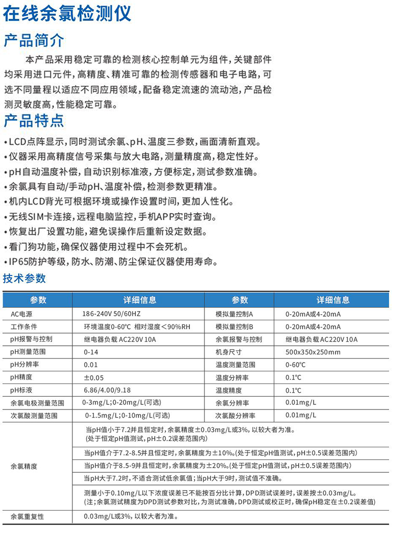 ·连续快速的监测医疗废水中的余氯含量,仪表具有高度的智能化和灵活性,可同时测量余氯、温度。