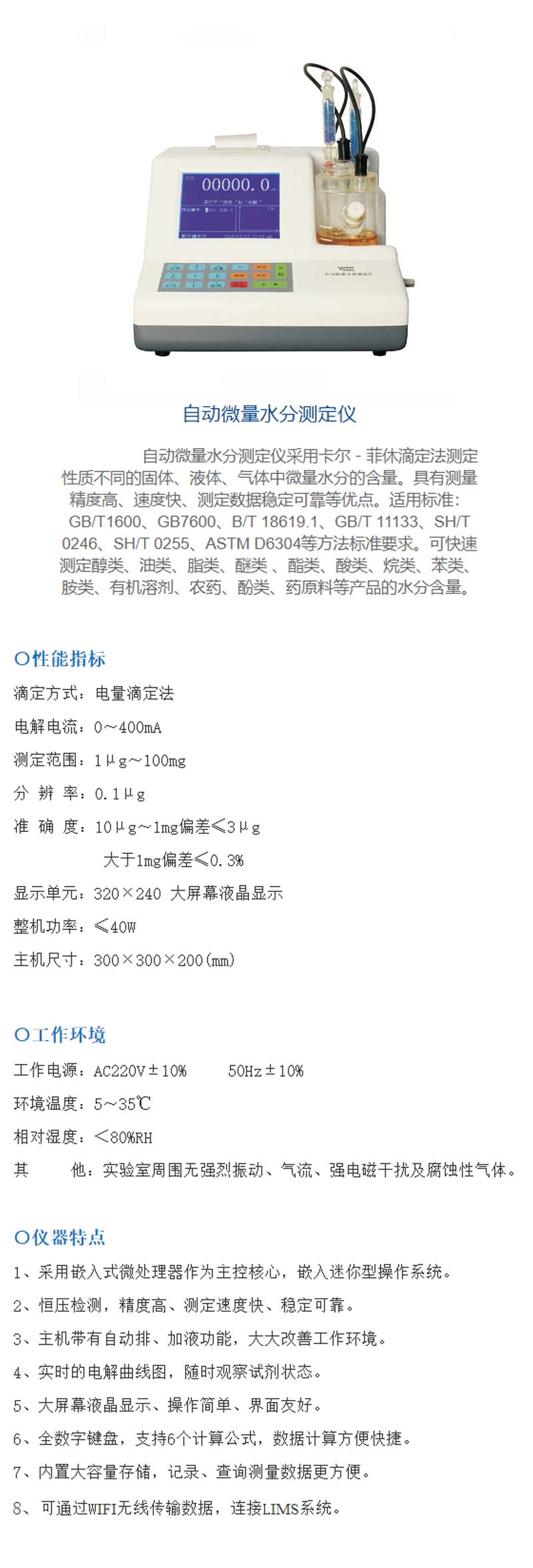 ·采用嵌入式微处理器作为主控核心,嵌入迷你型操作系统。 ·恒压检测,精度高、测定速度快、稳定可靠。 ·主机带有自动排、加液功能,大大改善工作环境。 ·实时的电解曲线图,随时观察试剂状态。 ·大屏幕液晶显示、操作简单、界面友好。 ·全数字键盘,支持6个计算公式,数据计算方便快捷。 ·内置大容量存储,记录、查询测量数据更方便。 ·可通过WIFI无线传输数据,连接LIMS系统。