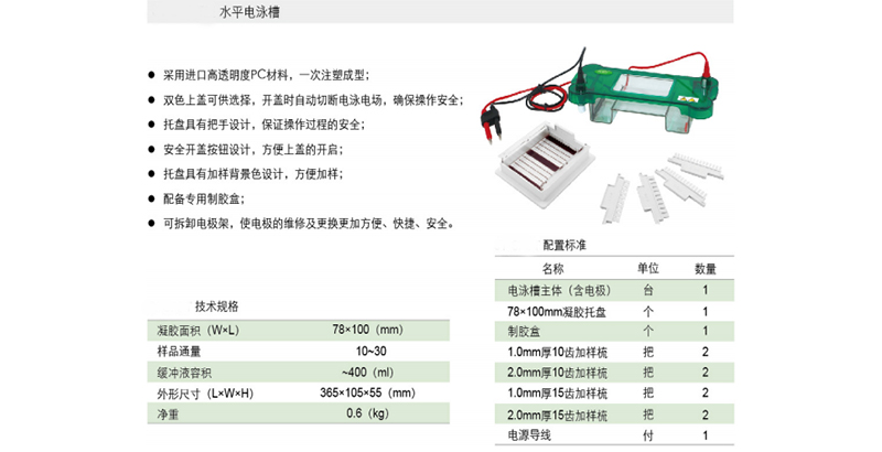 ·采用进口高透明度PC材料,一次注塑成型; ·双色上盖可供选择,开盖时自动切断电泳电场,确保操作安全;托盘具有把手设计,保证操作过程的安全; ·安全开盖按钮设计,方便上盖的开启; ·托盘具有加样背景色设计,方便加样; ·配备专用制胶盒; ·可拆卸电极架,使电极的维修及更换更加方便、快捷、安全。