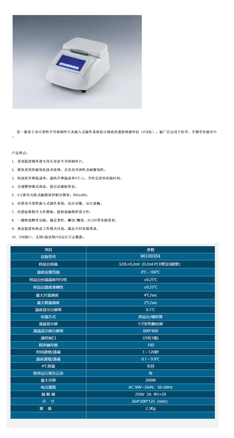 ·采用温度循环器专用长寿命半导体制冷片。 ·模块采用阳极氧化技术处理,具有高导热性及耐腐蚀性。 ·快速的升降温速率,最快升降温速率4℃/s,节约宝贵的实验时间。自调整伸缩式热盖,能自动紧贴管盖 ·5寸彩色电阻式触摸屏控制分辨率:800x480。 ·内置高可靠性嵌入式操作系统,反应灵敏,运行流畅。内置标准程序文件模板,能快速编辑所需文件。 ·一键快速孵育功能,满足变性、酶切/酶连、ELISA等实验需要热盖温度和热盖工作模式可设,满足不同实验需求。 ·USB接口,支持U盘读取PCR运行日志数据。