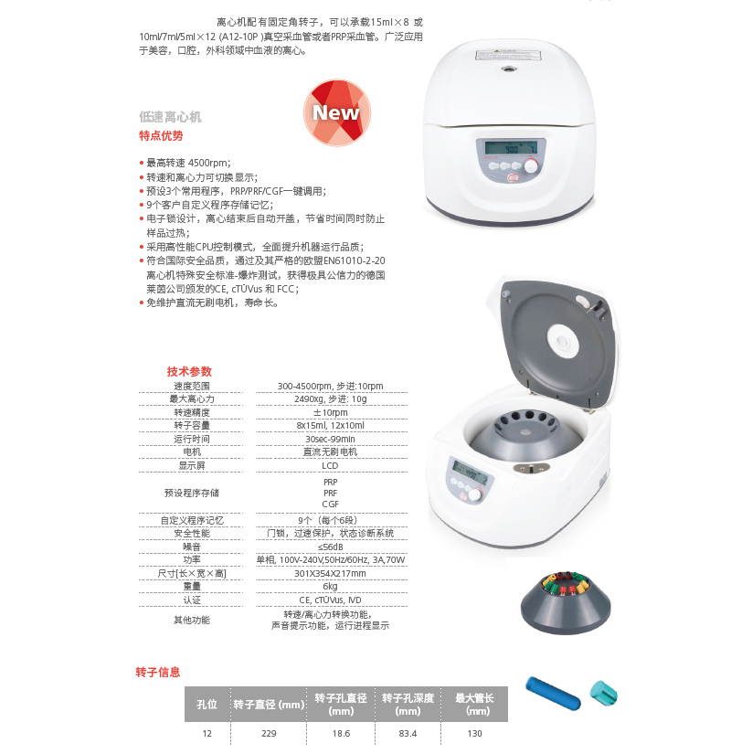 ·微处理器控制系统,保证速度控制的精准性,分离效果更好; ·LCD显示屏,可实时显示运行参数; ·转速和离心力可切换显示; ·直流无刷电机,免维护,安全,转速控制精准; ·瞬时离心功能,扩展了商品的应用; ·电子锁设计,离心结束后自动开盖,节省时间同时防止样品过热; ·开机自检,显示累计运行时间和上次运行参数