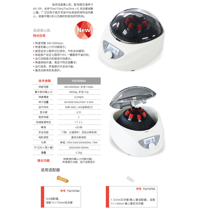 ·微处理器控制系统,保证速度控制的精准性,分离效果更好; ·LCD显示屏,可实时显示运行参数; ·转速和离心力可切换显示; ·直流无刷电机,免维护,安全,转速控制精准; ·瞬时离心功能,扩展了商品的应用; ·电子锁设计,离心结束后自动开盖,节省时间同时防止样品过热; ·开机自检,显示累计运行时间和上次运行参数