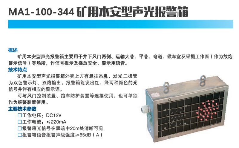 ·矿用本安型声光报警箱外壳上方有悬挂吊鼻,发光二极管为双色警示灯、双路输出,报警箱能发出红、绿两种颜色的光信号并伴有相应的警示语。 可与风门控制装置、跑车防护装置等连接使用,也可单独作为报警装置使用。