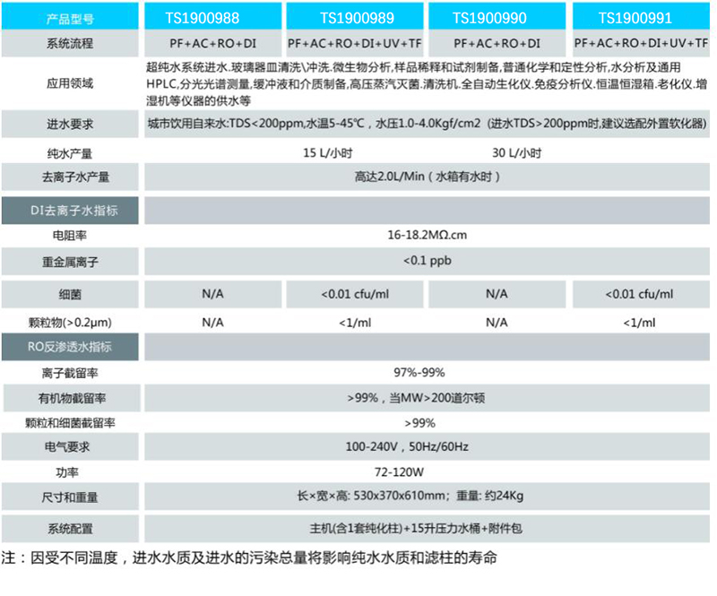 ·超纯水系统进水,玻璃器皿清洗\冲洗,微生物分析,样品稀释和试剂制备,普通化学和定性分析,水分析及通用HPLC,分光光谱测量,缓冲液和介质制备,高压蒸汽灭菌、清洗机、全自动生化仪、免疫分析仪、恒温恒湿、老化仪、增湿机等仪器的供水等。