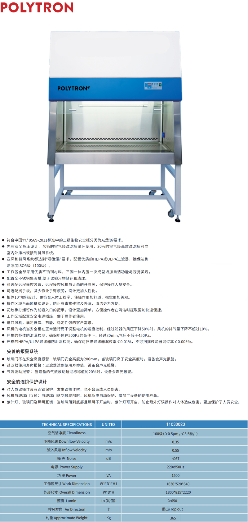·符合中国YY/ 0569-2011标准中的二级生物安全柜分类为A2型的要求; ·内腔安全负压设计,70%的空气经过滤后循环使用,30%的空气经高效过滤后可向室内外排出或接到排风系统; ·送风和排风系统都达到"零泄漏"要求,配置优质的HEPA或ULPA过滤器,确保达到洁净度ISO5级(100级); ·工作区全部采用优质不锈钢材料,三围一体内胆一次成型增加自洁功能与视觉美观; ·配置全不锈钢集液槽,便于试验污物储存和清理; ·可选配远程遥控装置,远程操控风机与灭菌的开与关,保护操作人员安全; ·可选配搁手板,减少作业手臂疲劳,设计更加人性化; ·柜体10°倾斜设计,更符合人体工程学,使操作更加舒适,视觉更加美观; ·操作区域台面凹槽式设计,防止有毒物残留及外漏,清洁更为方便; ·花纹手拧螺钉作为前吸入口的把手,设计更加简单,方便操作者在清洁时提取更加快速便捷; ·工作区域配置安全电源插座,便于操作者使用; ·进口风机,满足低噪、节能、稳定性强的客户需求; ·风机的电机当安全柜在正常运行而不调整电机的速度控制,经过滤器的风压下降50%时,风机的排气量下降不超过10%; ·严格的柜体防泄漏检测,确保柜体在500Pa的条件下,经过30min,气压不低于450Pa; ·严格的HEPA/ULPA过滤器防泄漏检测,确保可扫描过滤器漏过率≤0.01%,不可扫描过滤器漏过率≤0.005%。