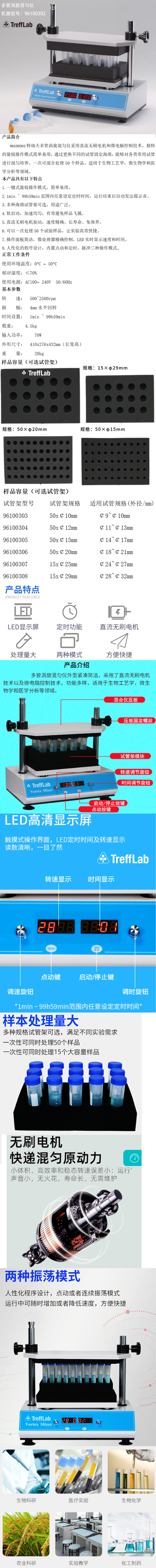 ·一键式旋钮操作模式,简单易用。 ·1min~99h59min范围内任意设定定时时间,运行结束后自动发出提示音。 ·多种海绵试管架可选,用途广泛。 ·软启动,加速均匀,有效避免样品飞溅。 ·直流无刷电机驱动,速度精确、长寿命、免保养。 ·最多可以一次处理50个试验样品,LED 实时显示速度和时间。 ·操作面板简洁,微处理器精确控制,LED实时显示速度和时间。 ·人性化的程序设计,内置电动和定时两种操作模式。