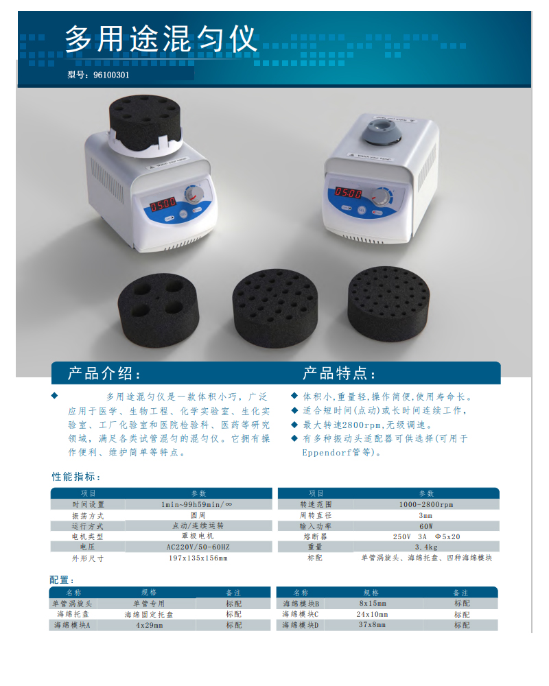 ·体积小,重量轻,操作简便,使用寿命长。 ·适合短时间(点动)或长时间连续工作。 ·最大转速2800rpm,无级调速。 ·有多种振动头适配器可供选择(可用于Eppendorf管等)
