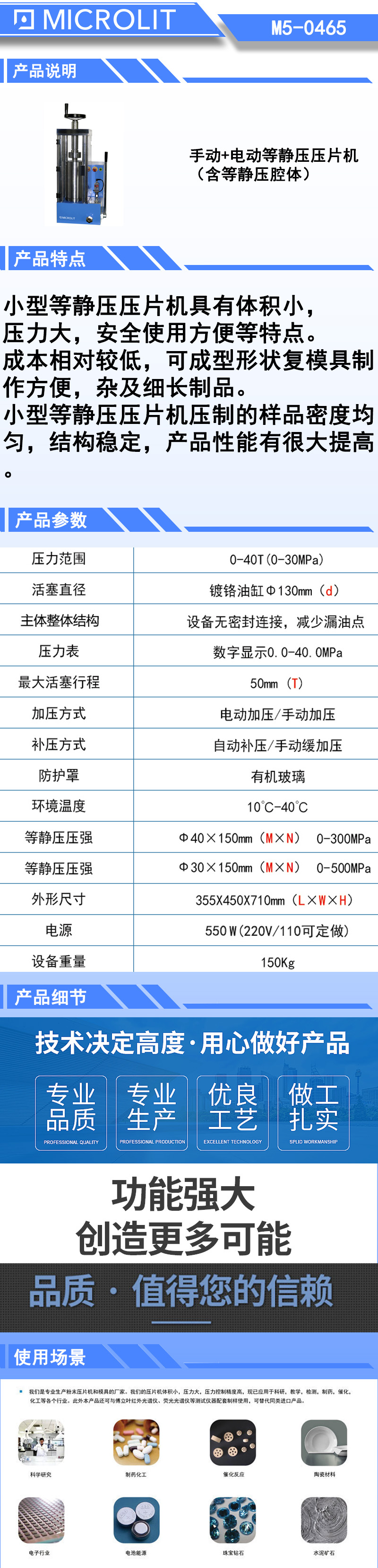 *小型等静压压片机具有体积小,压力大,安全,使用方便等特点。 *模具制作方便,成本相对较低,可成型形状复杂及细长制品。 *小型等静压压片机压制的样品密度均匀,结构稳定,产品性能有很大提高。