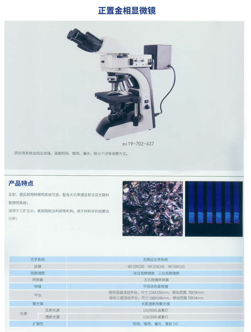 ·正置明场,斜照明,简易偏光等多种观察功能 ·总放大倍数:50X,100X,200X,500X,1000X选配;无限远色差校正,长物距光学系统