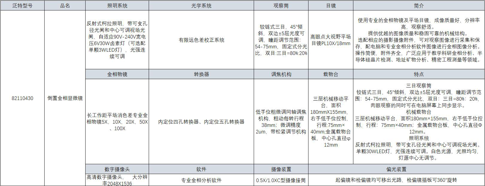 ·三目观察筒 铰链式三目,45°倾斜,双边±5屈光度可调,瞳距调节范围:54-75mm,固定式分光比,双目:三目=80%:20%,肉眼观察的同时可在电脑屏幕上同步显示。 机械载物台 三层机械移动平台,面积180mm×155mm,右手低手位控制,行程:75mm×40mm;金属载物台板,中心孔直径Φ12mm。 照明系统 反射式柯拉照明,带可变孔径光阑和中心可调视场光阑。单颗30WLED灯,光强连续可调。白色光源,光照均匀,灯源中心无调节。 ·使用专业的金相物镜及平场目镜,成像质量好,分辨率高,观察舒适。 提供优越的图像质量和稳固可靠的机械结构。 选配相应的摄影摄像附件,可对观察图像进行采集和保存,配电脑和专业金相分析软件图像进行金相图像分析。 操作简便,附件齐全,广泛应用于教学科研金相分析、半导体硅晶片检测、地址矿物分析、精密工程测量等领域。