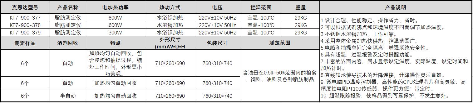 B55408 KT7-900-378 0.5%~60%范围内的粮食 饲料 油料及各种脂肪制品 6个 600W 水浴锅加热 控温范围 溶剂回收 外形尺寸(W×D×H) 760mm×310mm×740mm 29kg 15014.40
