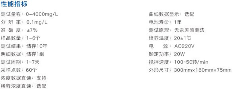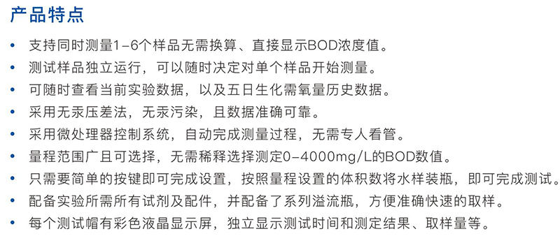 ·支持同时测量1-6个样品无需换算、直接显示BOD浓度值。测试样品独立运行,可以随时决定对单个样品开始测量。 ·采用微处理器控制系统,自动完成测量过程,无需专人看管。 ·量程范围广且可选择,无需稀释选择测定0-4000mg/L的BOD数值。 ·只需要简单的按键即可完成设置,按照量程设置的体积数将水样装瓶,即可完成测试。 ·每个测试帽有彩色液晶显示屏,独立显示测试时间和测定结果、取样量等。