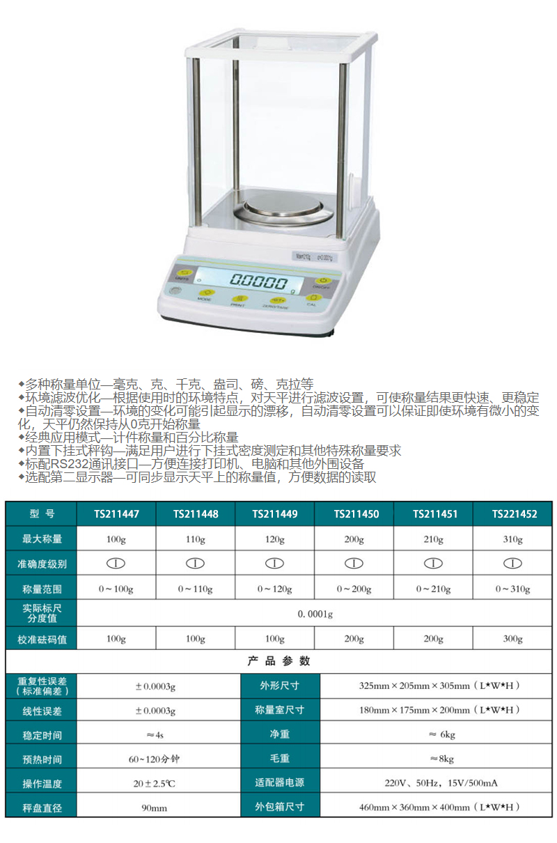 规格:  最大称量200g 制造商型号:  TS211450