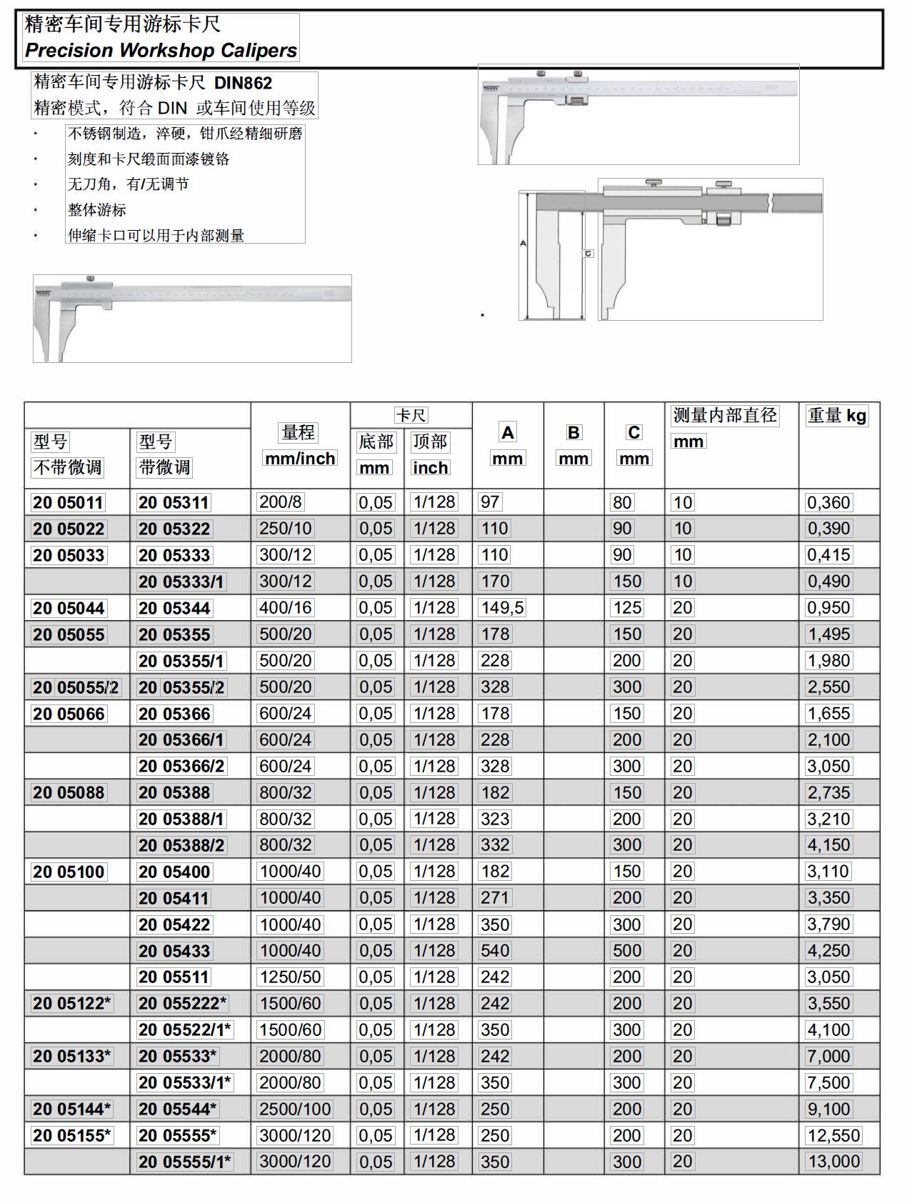 ·精密模式. 符合 DIN 或车间使用等级不锈钢制造. 猝硬. 钳爪经精细研磨刻度和卡尺缎面面漆锁铭