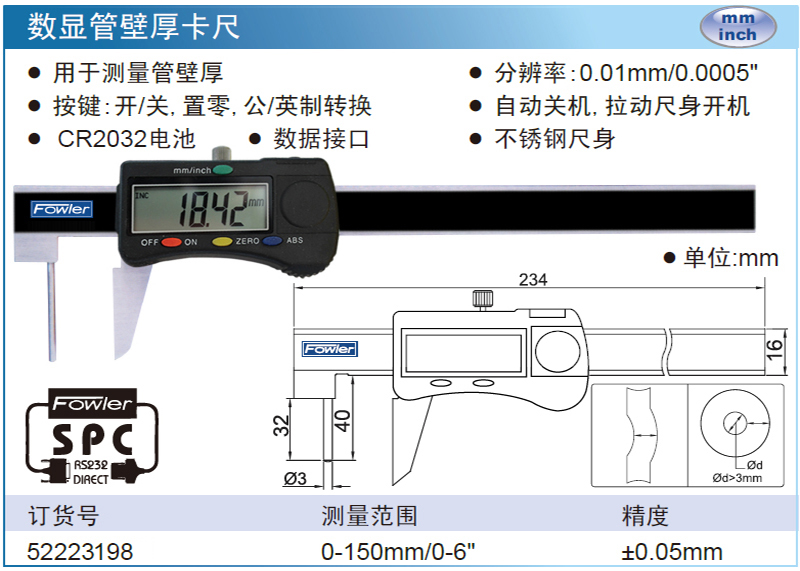 FOWLER 数显管壁厚卡尺 52223198 0-150mm 0-6" 0.01mm