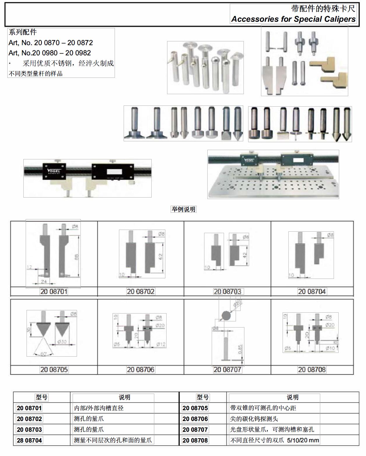 ·测量不同层次的孔和面的量爪 ·系列配件 ·Art. No. 20 0870 - 20 0872 ·Art. No.20 0980 - 20 0982 ·采用优质不锈钢. 经悴火制成不同类型量杆的样品