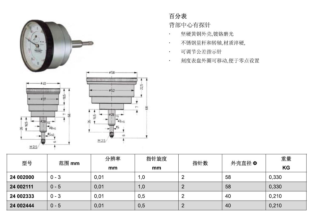 ·坚硬黄铜外壳·镀铬磨光 ·不锈钢量杆和转轴·材质淬硬· ·可调节公差指示针 ·刻度表盘外圈可移动·便于零点设置