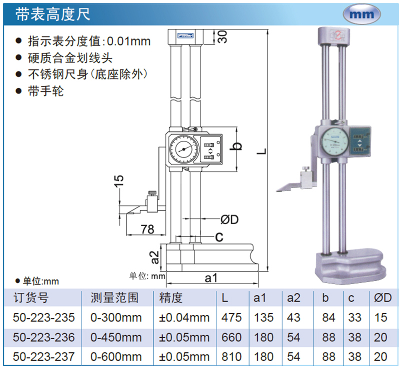 ·指示表分度值:0.01mm ·硬质合金划线头 ·不锈钢尺身(底座除外) ·带手轮