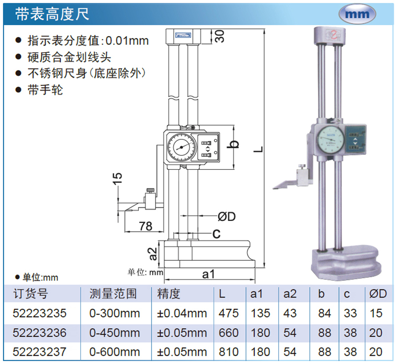 FOWLER 带表高度尺 52223236 0-450mm 0.01mm