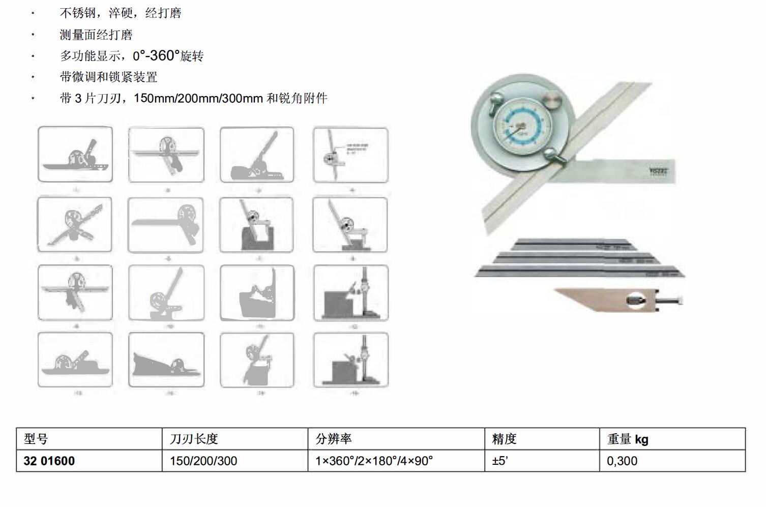 ·不锈钢. 滓硬. 经打磨 ·测量面经打磨 ·多功能显示. 0°-360°旋转 ·带微调和锁紧装置 ·带 3 片刀刃. 150mm/200mm/300mm 和锐角附件