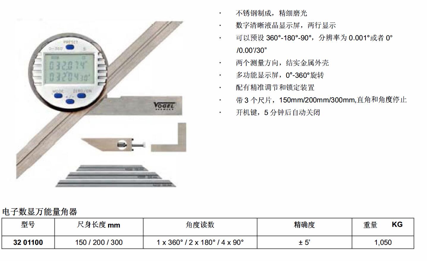 ·不锈钢制成. 精细磨光 ·数字清晰液晶显示屏. 两行显示 ·可以预设 360°-1ao0-90° . 分辨率为 0.001°或者 o· /0.00'/30" ·两个测量方向. 结实金属外壳 ·多功能显示屏. 0°-360°旋转 ·配有精准调节和锁定装置 ·带 3 个尺片. 150mm/200mm/300mm直角和角度停止开机键. 5分钟后自动关闭
