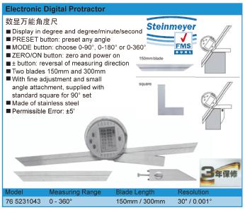 ·显示度数和度/分秒 ·1PRESET按钮:预设任何角度 ·MODE按钮:选择o-90,o-18o“或0-360- ·1ZEROION按钮:调零并打开电源150n ·+按钮:反转测量方向 ·两个刀片150mm和300mm ·微调小 ·Stgua ·角度附件,随附 ·9o°设置的标准正方形 ·由不锈钢制成 ·允许的误差:15'