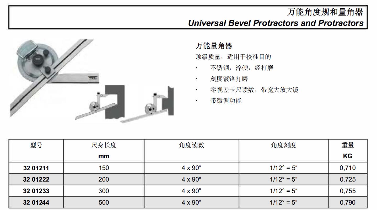 ·万能量角器 ·顶级质量. 适用于校准目的不锈钢. 滓硬. 经打磨 ·刻度锁铭打磨 ·零视差卡尺读数. 带宽大放大镜带微调功能