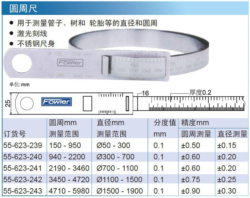 ·用于测量管子、树和 轮胎等的直径和圆周 ·激光刻线 ·不锈钢尺身