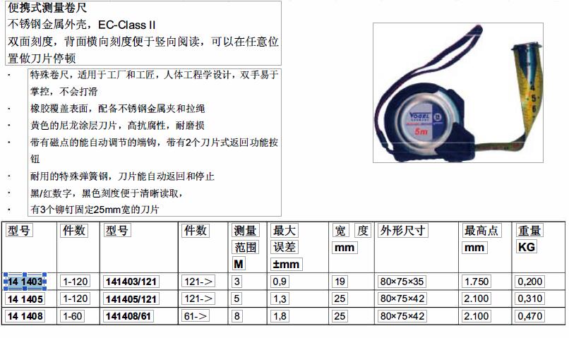 ·特殊卷尺,适用于工厂和工匠,人体工程学设计,双手易于掌控,不会打滑 ·橡胶覆盖表面,配备不锈钢金属夹和拉绳 ·黄色的尼龙涂层刀片,高抗腐性,耐磨损 ·带有磁点的能自动调节的端钩,带有2个刀片式返回功能按钮 ·耐用的特殊弹簧钢,刀片能自动返回和停止 ·黑/红数字,黑色标度便于清晰读取 ·3个铆钉固定25mm宽的刀片