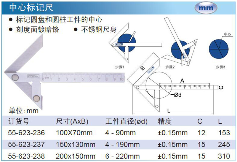 ·标记圆盘和圆柱工件的中心 ·刻度面镀暗铬 ·不锈钢尺身