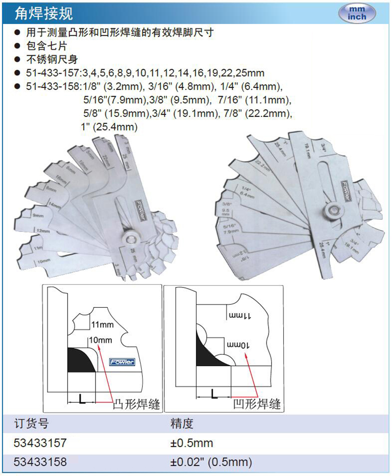 ·用于测量凸形和凹形焊缝的有效焊脚尺寸·包含七片·不锈钢尺身·51-433-157:3,4,5,6,8,9,10,11,12,14,16,19,22,25mm·51-433-158:1/8"(3.2mm),3/16"(4.8mm),1/4"(6.4mm),5/16"(7.9mm),3/8"(9.5mm),7/16"(11.1mm),5/8"(15.9mm),3/4"(19.1mm),7/8"(22.2mm),1"(25.4mm)